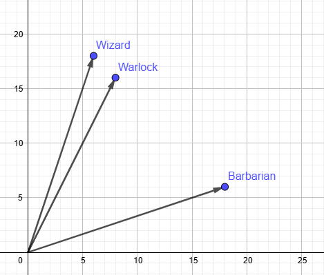 Looking at the Cartesian plane we just drew, we notice something immediately: The Wizard's point (6, 18) is geometrically very close to the Warlock's (8, 16). The Barbarian's point (18, 6) is very far from both.